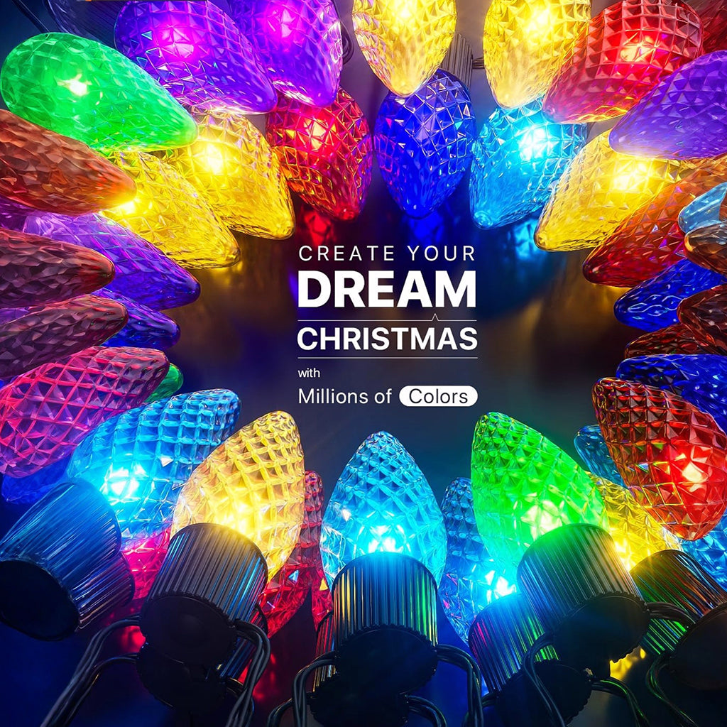 • 【DIY Outdoor Smart Christmas Lights】 This C9 LED Christmas light indoor/outdoor features 300(max) vintage-style diamond-cut, crack-resistant bulbs and comes with a 16.4-foot power cord,. It is durable enough to easily wrap around a tree, hang from an eave, or place anywhere. With app control, you can easily create a stunning atmosphere for parties and holiday celebrations.