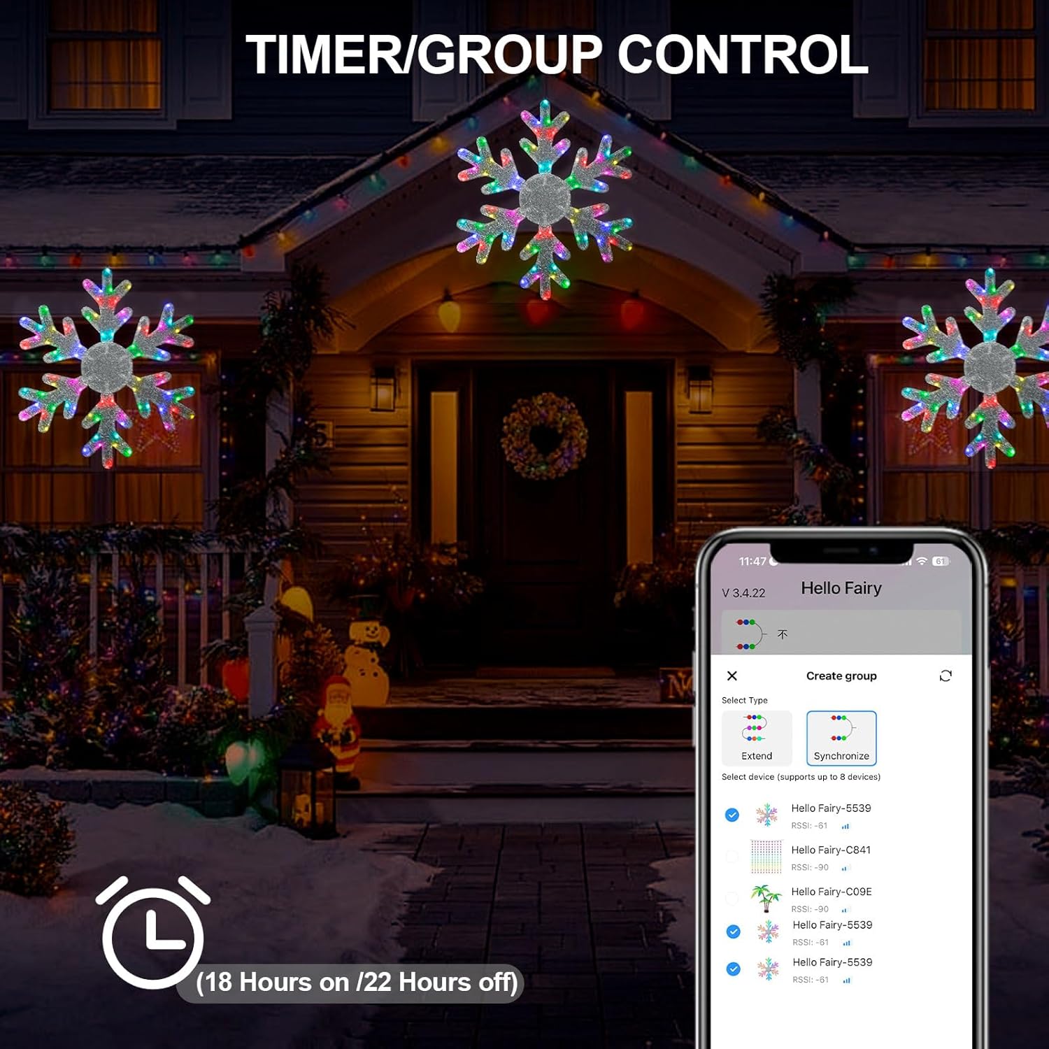 - Bluetooth APP Control for Effortless Customization: Easily control your outdoor LED snowflake lights with the Hello Fairy app. Adjust brightness, switch between 78 lighting modes, and create personalized light shows from the palm of your hand. Ideal for decorating your Christmas yard decor or creating an atmosphere for roof decorations.